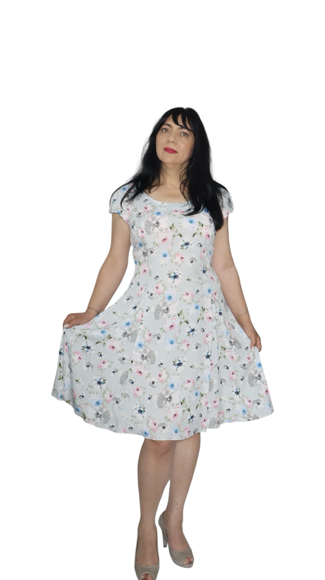 Rochie bleu ciel din vascoza, cu imprimeu floral pastelat si croi femini, perfecta pentru vara. Fabricata in Romania cu grija si stil.