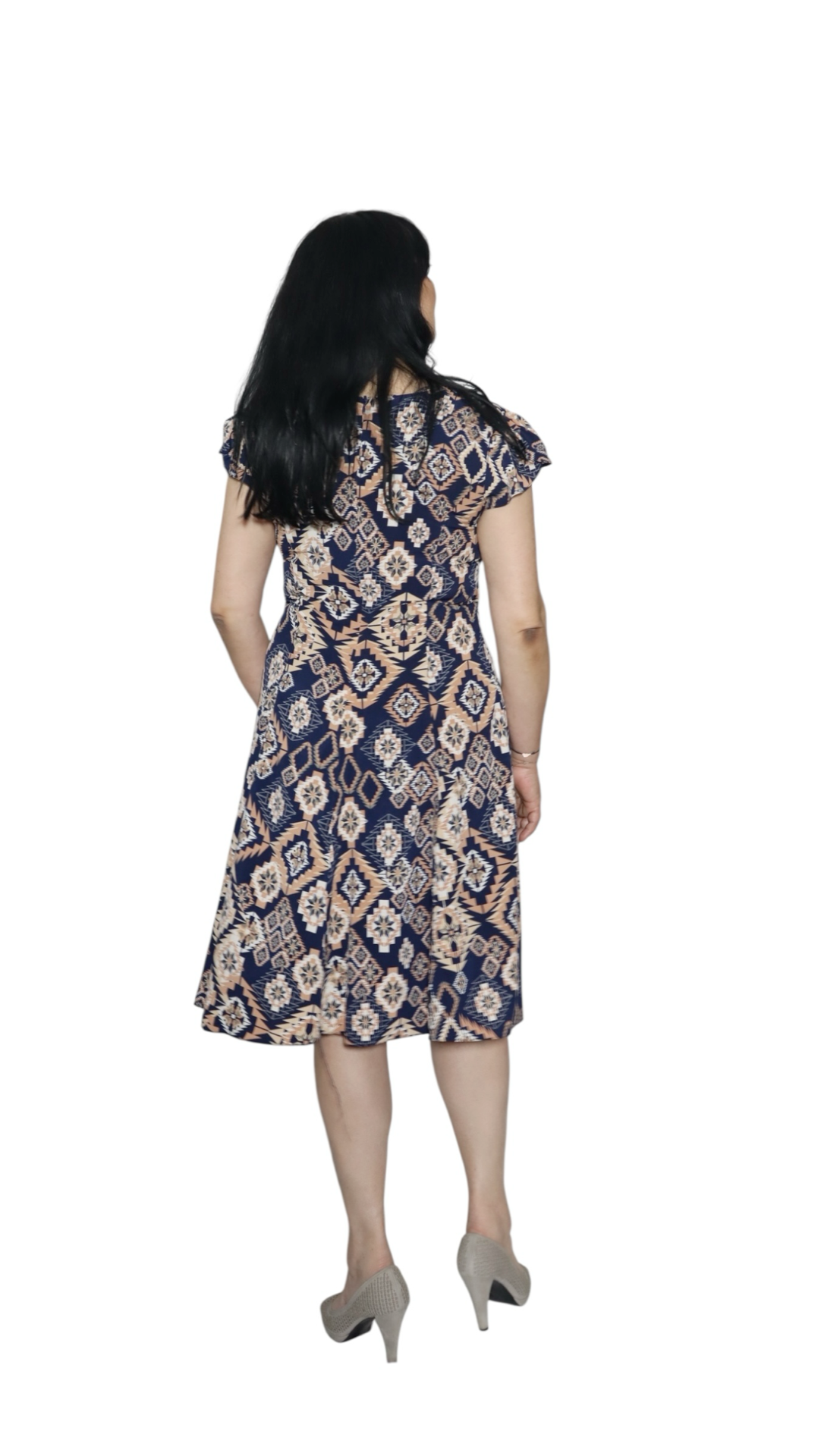 Rochie in clini cu imprimeu geometric in nuante de bleumarin si bej, ideala pentru tinutele de zi sau evenimente casual.